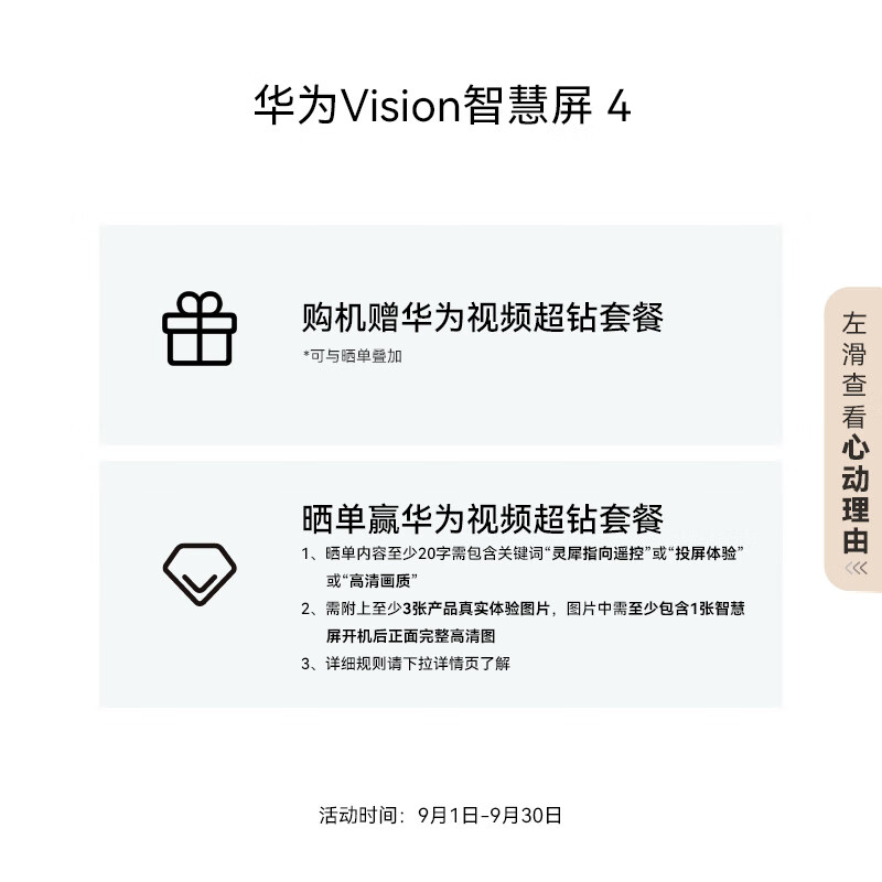 3、新品一上市就立马预定,等了好多天终于到货了尺寸够大用起来真爽。快递送货非常快,师傅安装上门也很快,态度很好不错的。综合使用下来,跟家里的华为设备能配套起来还能省掉一个摄像头还一个音箱非常棒