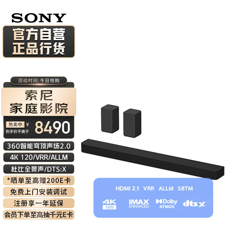 索尼(SONY)HT-A8000+RS3S 环绕强化套装 360智能穹顶 回音壁 4K120Hz VRR ALLM 家庭影院 电视音响 蓝牙价格:8490.00元!