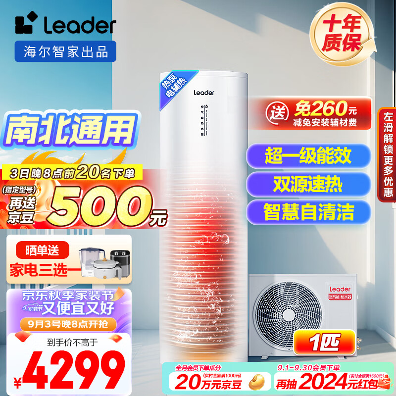 海尔(Haier)智家出品Leader空气能热水器200升包安装 一级能效一匹电辅南北通用升级WiFiPA7U1(4-6人)价格:4299.00元!
