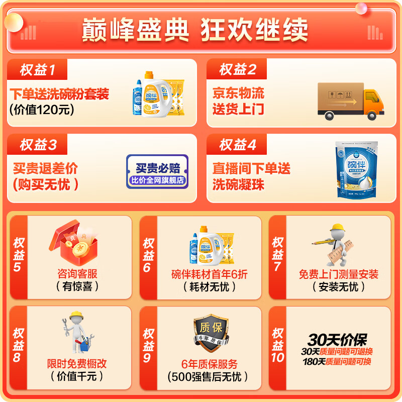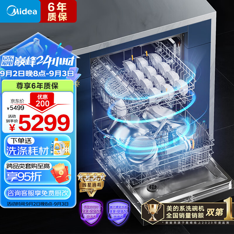 美的(Midea)万向2000洗碗机嵌入式14套大容量105℃热风烘干四星消毒一级水效168h存储变频万向星河黑色价格:5299.00元!